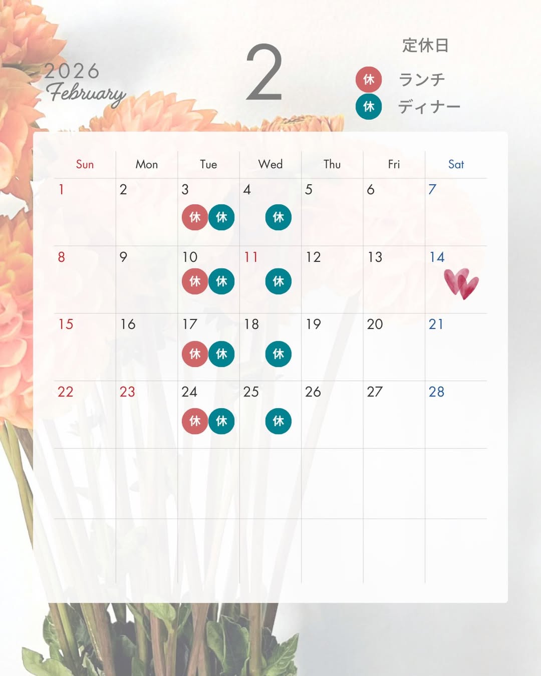 2月のお休みカレンダー📢です。