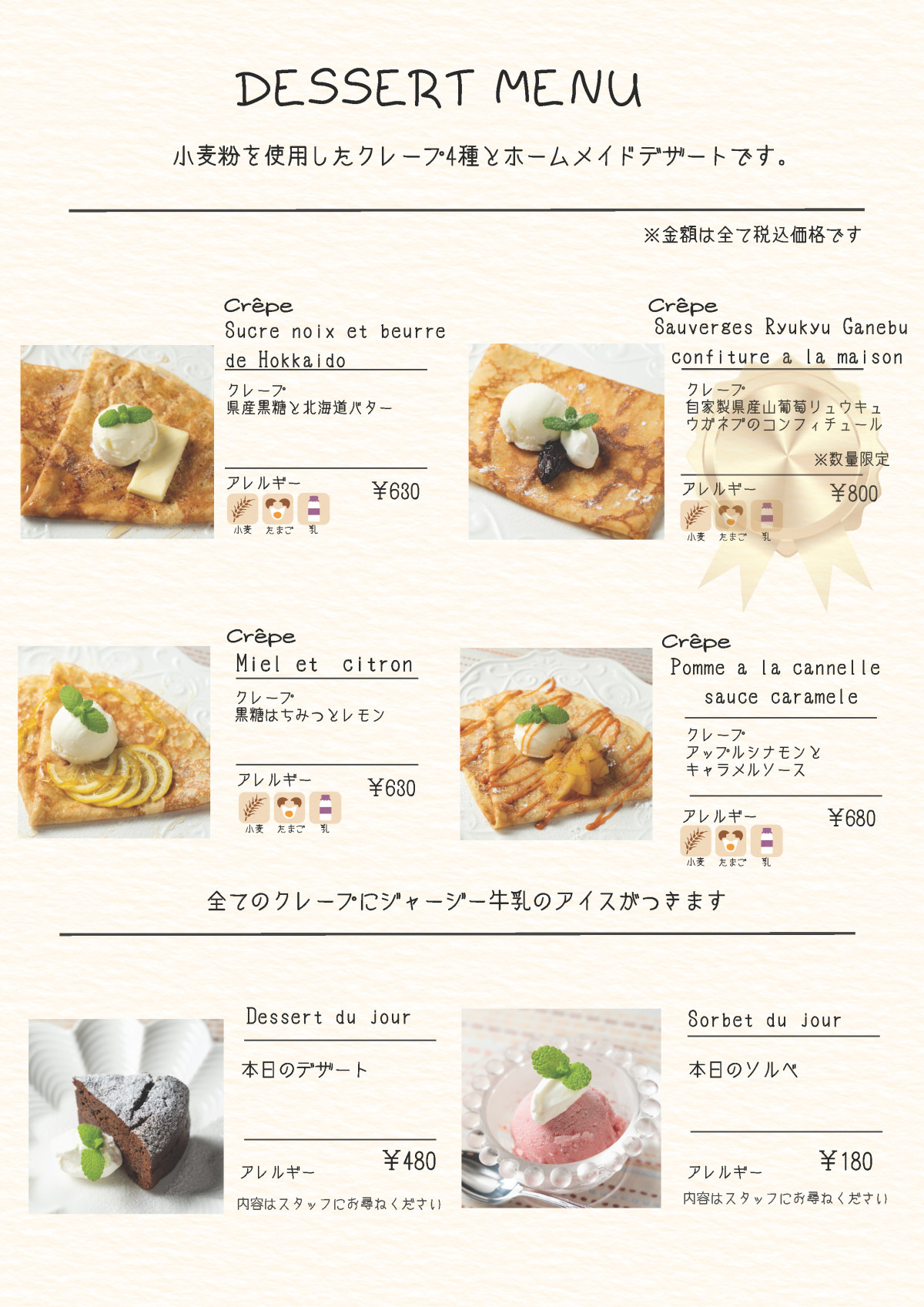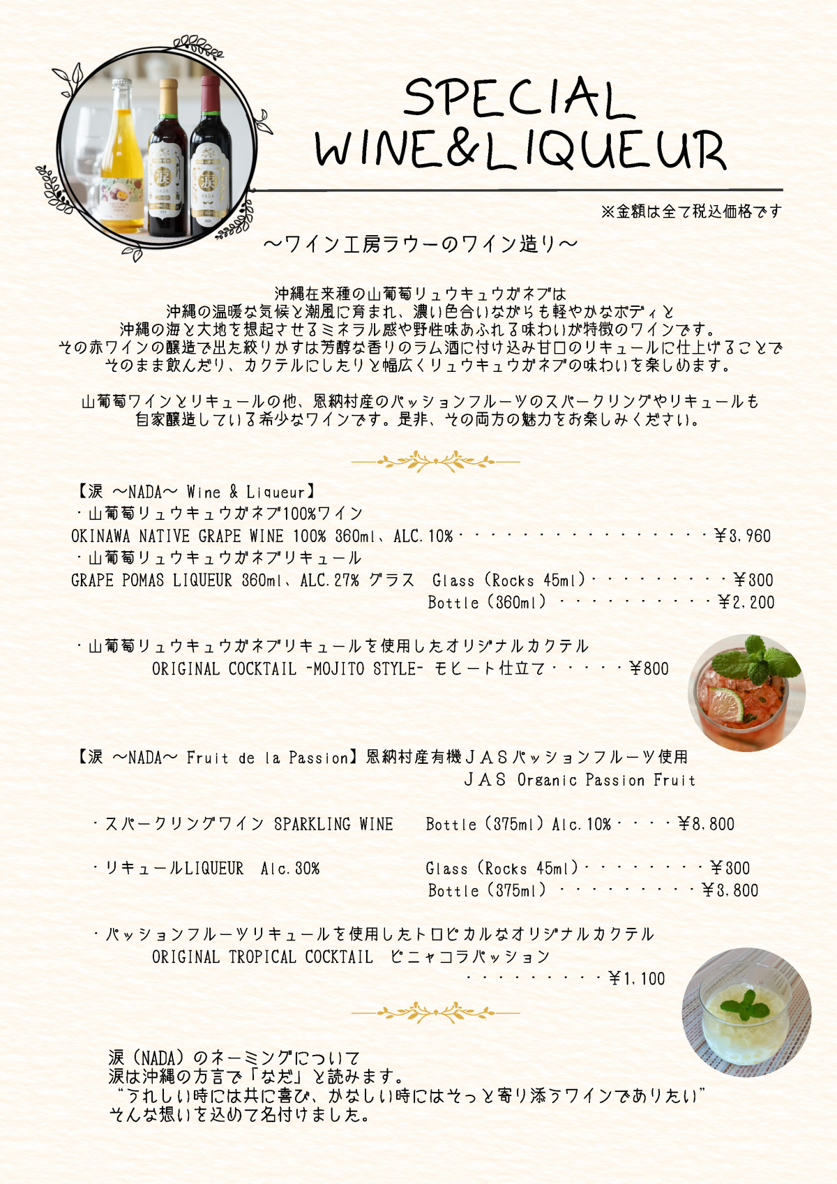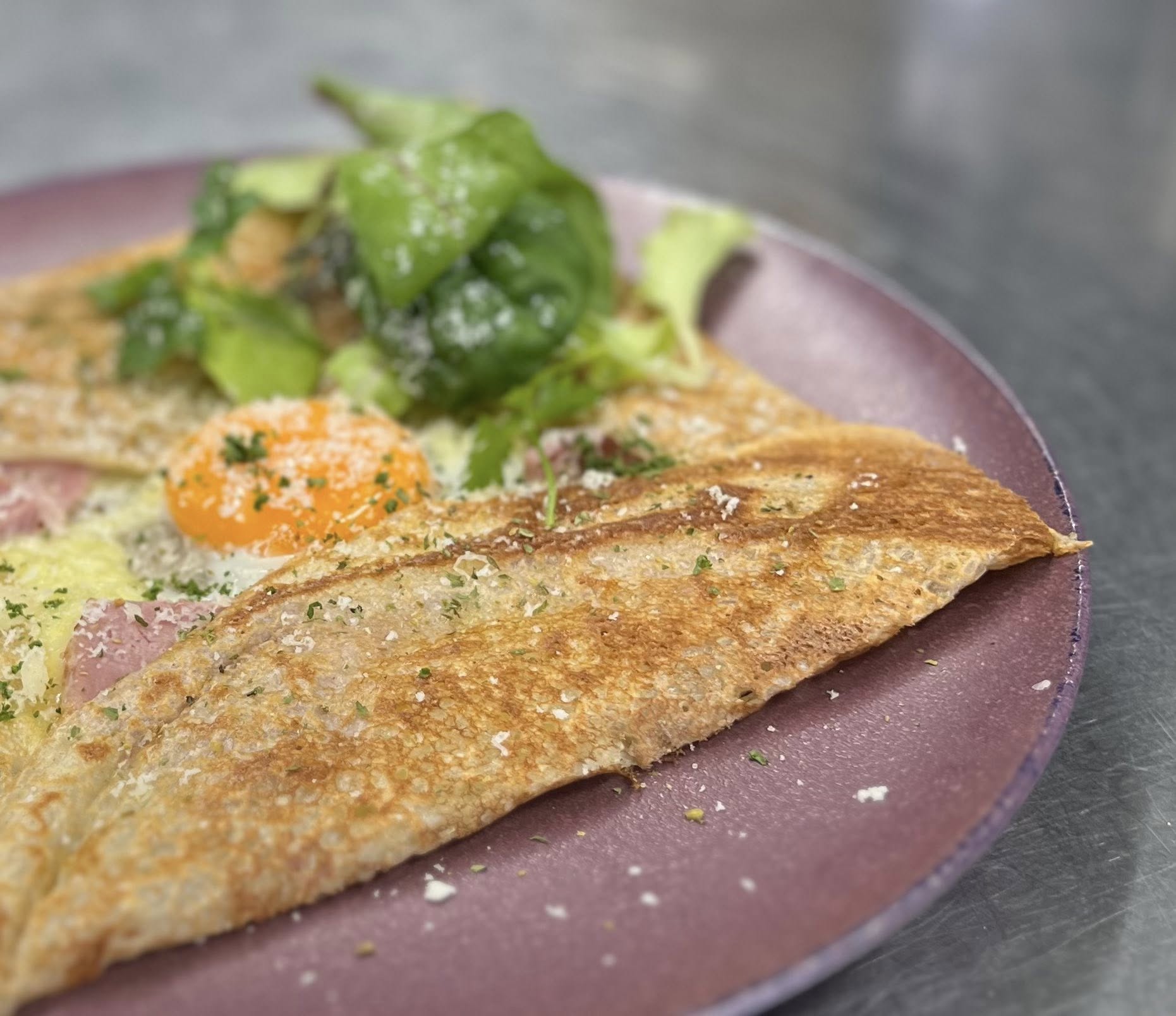 フランス・ブルターニュの地方料理「ガレット」を沖縄県産のそば粉と沖縄の食材をふんだんに使いご提供。ラウーならではのガレットを自家醸造ワイン【涙Nada】やシードルと共にお楽しみください。