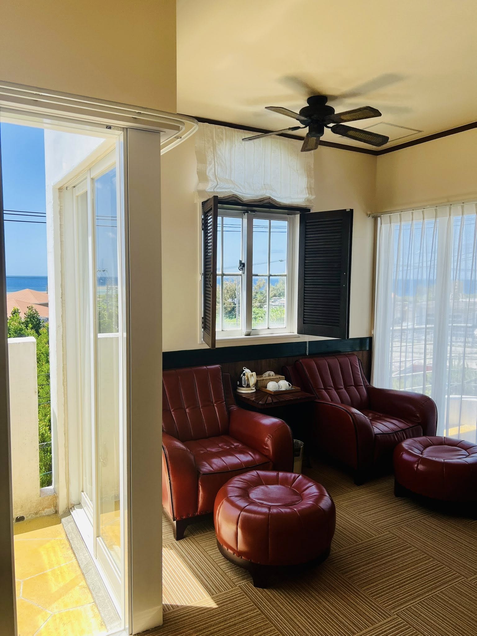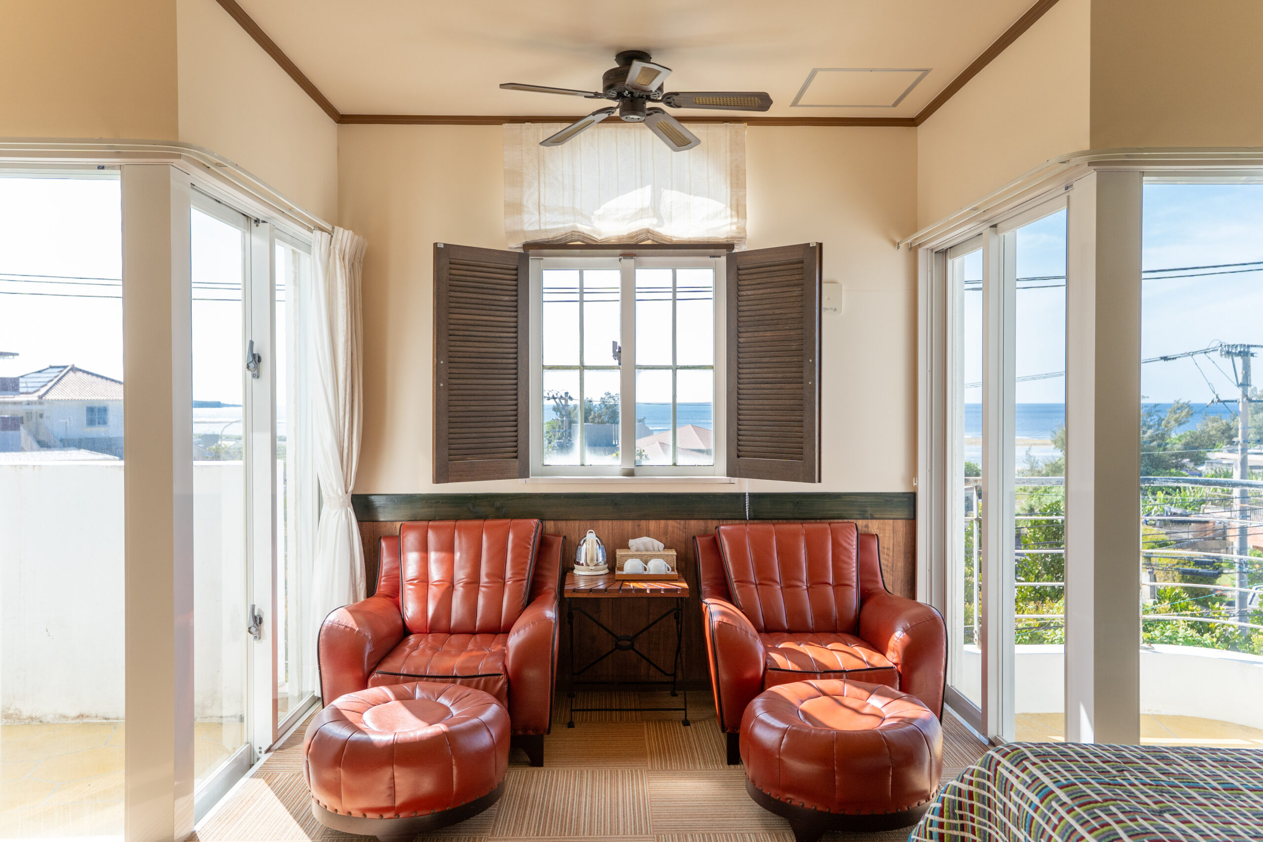 真っ赤なソファーが印象的で、ソファーのバックには、海が広がります。